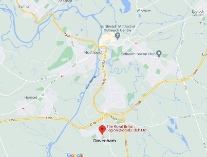 From the A556 Davenham Roundabout, head South on London Road. Take first right into Green Lane, continue on Green Lane till it ends at Hartford Road. Turn left onto Hartford Road, then right into Firth Fields. Continue on Firth Fields past a sharp right turn, and the British Legion is at the bottom on the left.